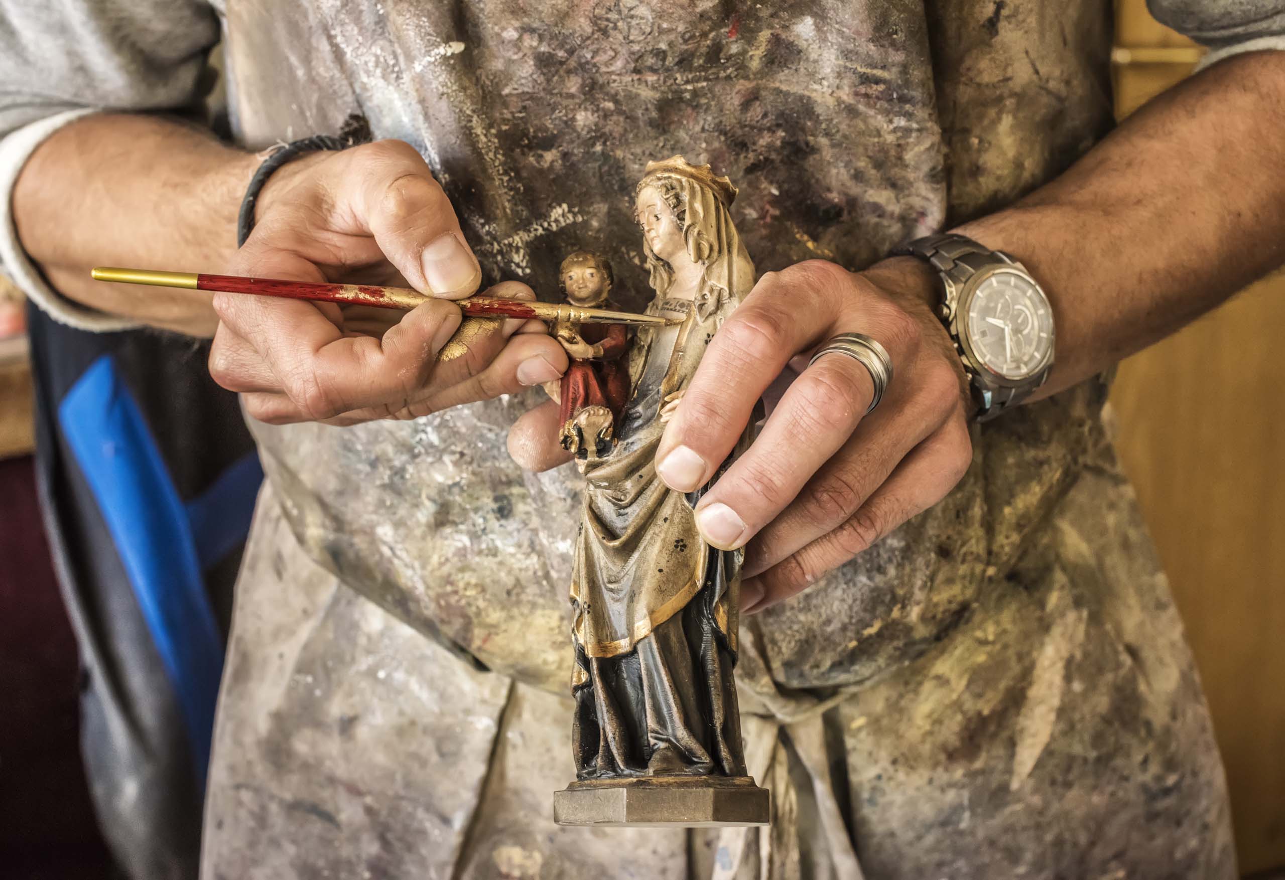 Holzschnitzerei in Südtirol – jahrhundertelange Tradition, exzellente Qualität und unverwechselbar schön. Besonders stolz sind wir auf die Fertigung handgefertigter Holzschnitzereien sakraler Natur. Unser Team fertigt passioniert Holzschnitzereien von Heiligen, wie dem heiligen Pater Pio, dem heiligen Erzengel Michael, dem heiligen Lazarus, dem seligen Carlo Acutis oder dem heiligen Josef an. Realisiert werden auch Darstellungen der unbefleckten Jungfrau Maria, Mutter Teresa von Kalkutta, der seligen Mutter Teresa Fasce und vieler anderer. Werfen Sie einen Blick auf unsere religiösen Kunstwerke aus Holz, lassen Sie die Bilder auf sich wirken und besuchen Sie uns in Lajen am Eingang des Grödnertals!